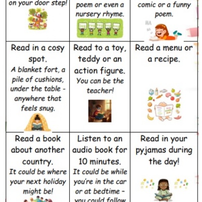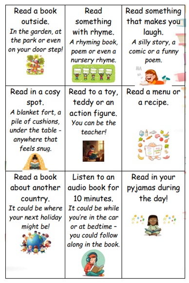 The theme for 'The Year of Reading 2026' is 'Read Your Way!' so we have set various reading challenges we hope will inspire your child to find something they enjoy reading that they may not have thought of. We hope that children will be able to complete as many of the challenges as possible and have a great time doing so. Once each challenge is completed, the challenge box on the sponsor form should be signed and dated by an adult.